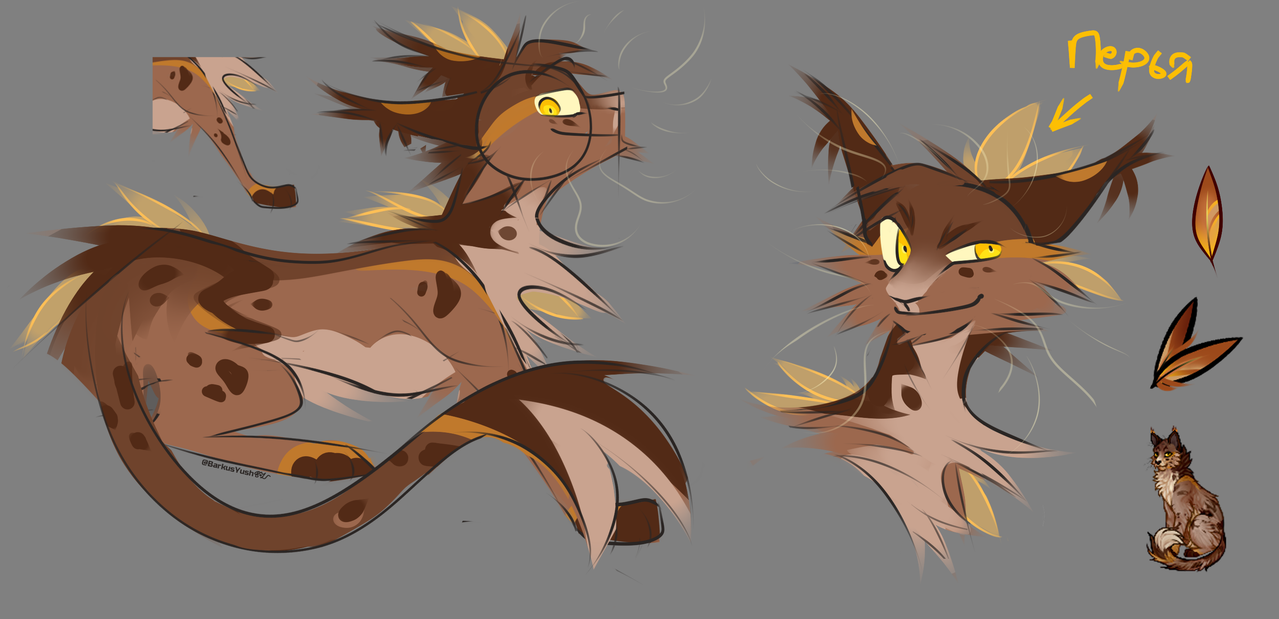 В жилах Балагура бурлит чистая Северная кровь, а корни родства уходят к Кочевникам, отсюда и отличительная комплекция — вытянутое тело и длинные, жилистые лапы, прекрасно служащие для скоростного или длительного перемещения. Благодаря своему телосложению ловок и без труда способен преодолевать любые препятствия, а длинный, хлёсткий хвост, на котором носит оберег матери, дарит высокую устойчивость, что большой плюс при лазании или беге. Отсутствие густой "брони" из меха компенсируется возможностью безпроблемного плавания и ныряния, после которого не придётся ещё очень долго сохнуть под солнцем. Говоря о шерсти — этот чудик до смешного лохмат, его не слишком короткая, приятная на ощупь шубка, никогда не бывает аккуратной, постоянно торча в разные стороны. Общий вид растрёпанности дополняют торчащие из колтунов, то тут, то там, жёлтые перья, так бережно подбираемые воспитанником под цвет собственных глаз. Он больше похож на гнездо, чем на кота, когда спит, а это хорошо дополняет его "птичий" образ.Где есть плюсы — там есть и минусы. Выделяясь скоростью, Балагур уступает в силе, при этом являясь вовсе не лучшим бойцом. Опция "побег" будет выигрышнее драки, несмотря на немаленький рост, превосходящий лесных жителей, но уступающий соклановцам. Тем не менее, дать отпор он способен, однако, как показывает практика, воспитанник больше огребает, чем побеждает.